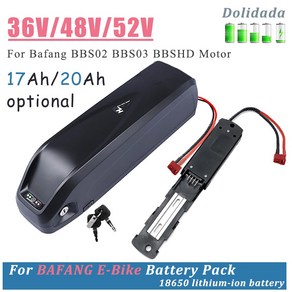 36V, 48V, 52V 전압 옵션을 지원하며 20Ah 용량으로 장거리 주행이 가능하고, USB 포트로 충전 편리성을 제공하며 500W BBS02 모터와 호환되는 전기 자전거 및 스쿠터용 배터리 제품